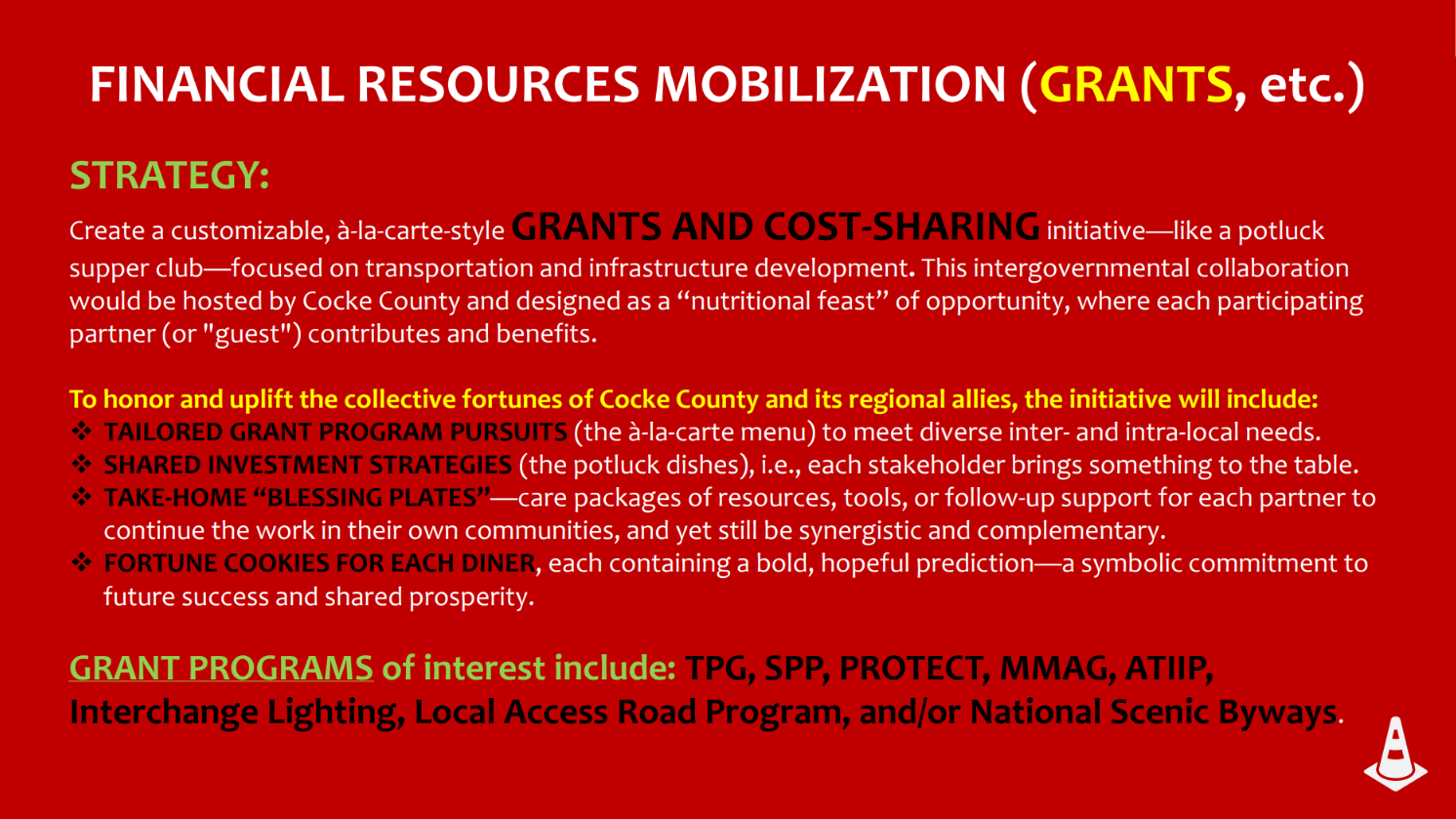 Grant programs and funding strategies play a key role in turning transportation planning into on-the-ground improvements. In Cocke County, the transportation plan is designed not only to identify needs, but also to position projects so they are competitive for state and federal funding opportunities.
